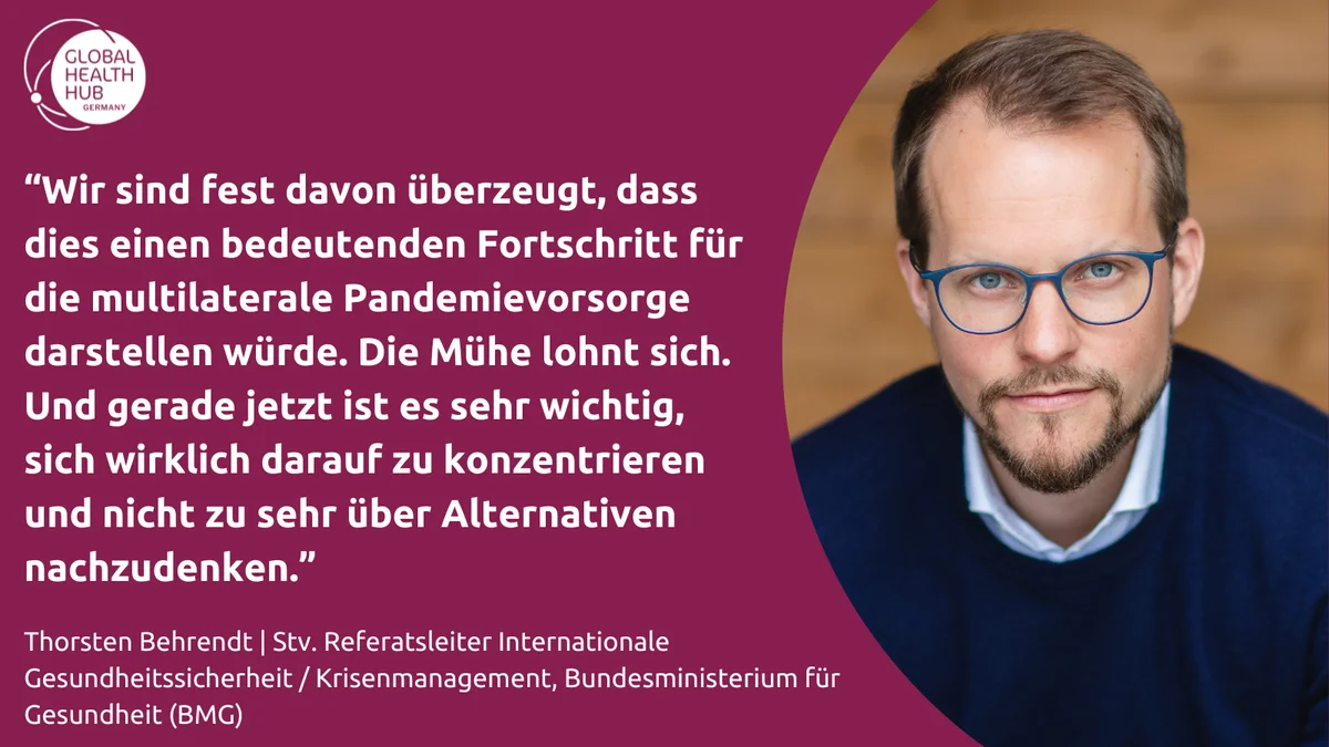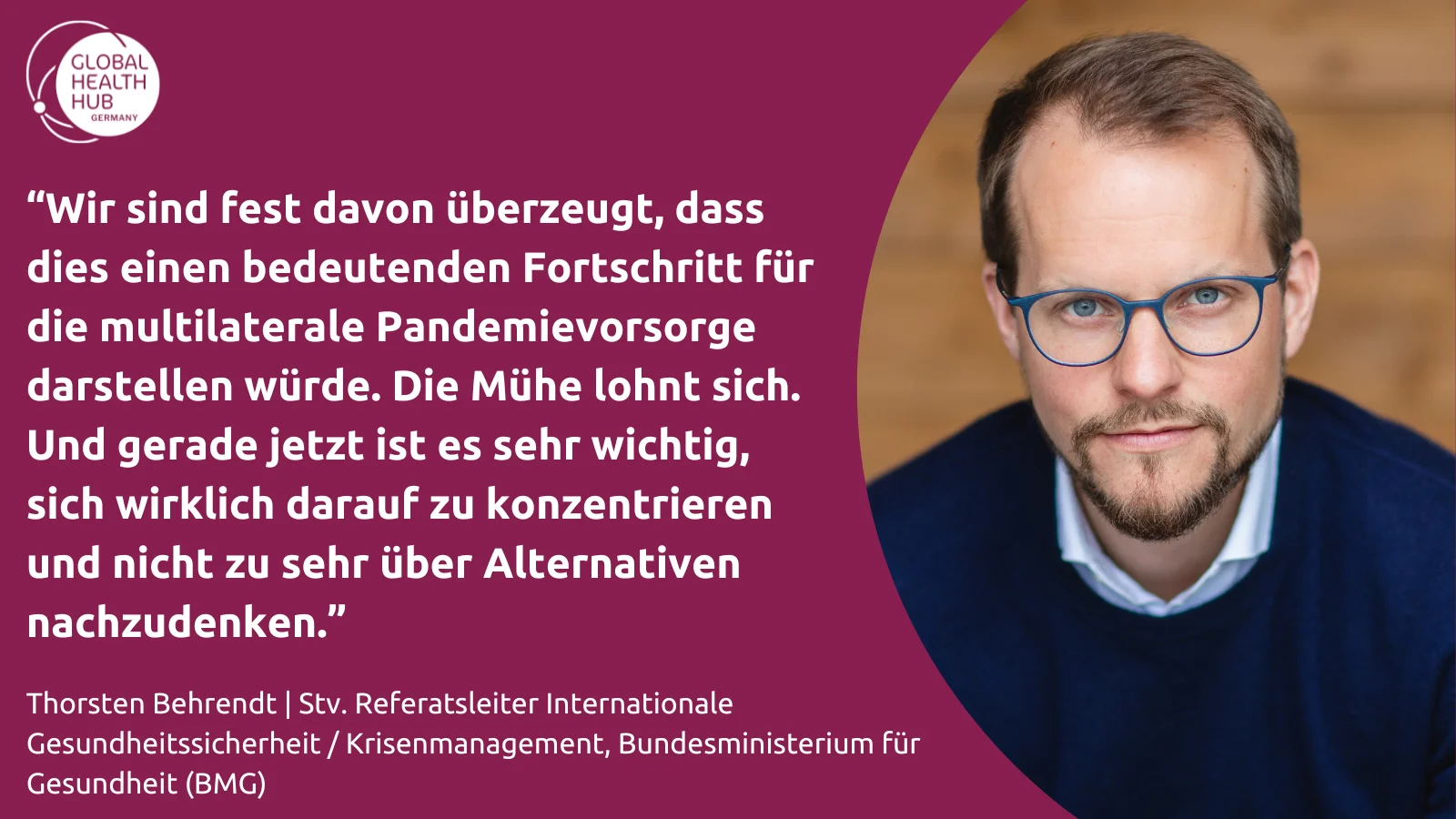 Da die Verhandlungsfrist schnell abläuft, lautet die zentrale Frage nun, ob vor Ablauf der Frist im Mai 2026 noch eine sinnvolle Einigung erzielt werden kann. Deutschland bleibt vorsichtig optimistisch, dass eine Einigung noch möglich ist. Behrendt betont, dass der Abschluss des Annex einen wichtigen Schritt für die multilaterale Pandemievorsorge darstellen würde. Gleichzeitig räumt er ein, dass Pragmatismus unerlässlich sein wird. Die Verhandlungsführer müssen sich möglicherweise jetzt auf die Kernelemente einigen und einige detailliertere Fragen der Umsetzung, wie beispielsweise den genauen Wortlaut der Verträge mit Unternehmen, späteren Prozessen im Rahmen der Konferenz der Vertragsparteien überlassen. Gleichzeitig warnt er davor, den Schwung zu verlieren: „Wir sollten nicht zu viel über Alternativen nachdenken, denn das nimmt auch den Druck, einen Konsens zu erzielen.“