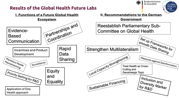 Ein besonderes Highlight des Tages war die interaktive Zukunftswerkstatt Globale Gesundheit. In sektorübergreifend zusammengesetzten Teams arbeiteten die Teilnehmenden zu drei prioritären Themenfeldern: Forschung und Innovation, Pandemic Prevention, Preparedness and Response (PPPR) und klimaresiliente und klimaangepasste Gesundheitssysteme. Mit großer Motivation und reger Beteiligung der Teilnehmenden wurden zentrale Funktionen einer zukunftsfähigen globalen Gesundheitsarchitektur identifiziert und konkrete Handlungsempfehlungen für die Bundesregierung entwickelt.