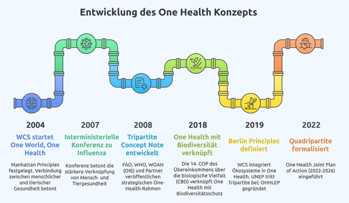 Deutschland setzt sich seit langem für One Health ein und hat den Ansatz seit seiner G7-Präsidentschaft 2015 fest in der globalen Gesundheitspolitik verankert. One Health wurde zentral für Strategien zur Bekämpfung antimikrobieller Resistenzen (AMR) und zur Pandemievorsorge. Die G20-Gesundheitsministerkonferenz 2017, die BMZ 2030-Reformstrategie und die deutsche Globale Gesundheitsstrategie (2020) haben dieses Engagement weiter gestärkt.
