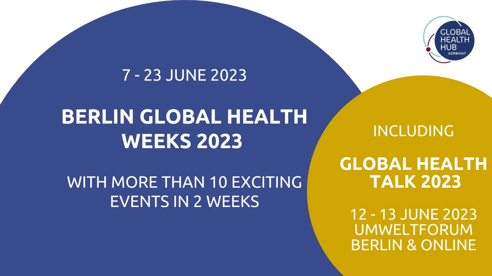 We are delighted to invite you to this year’s Global Health Talk on 12 - 13 June 2023 at the Umweltforum Berlin (Pufendorfstraße 11, 10249 Berlin) or virtually.