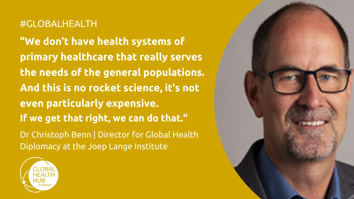 Christoph Benn: I've been involved in the Global Health Hub Germany since its inception in 2019. It has already contributed greatly to positioning Germany better on the global agenda, but also to facilitate much closer collaboration between stakeholders in Germany. I've been working in global health for more than 30 years, and I've often seen how other countries played a leading role, like the UK, like France, but even smaller countries like the Netherlands or Australia. They often had better networks, the civil society was working more closely with the government, there was much closer collaboration. It was those institutions and organisations that were then called to represent at international boards and meetings. Germany, while a very big donor in global health, was always lacking a little bit behind.