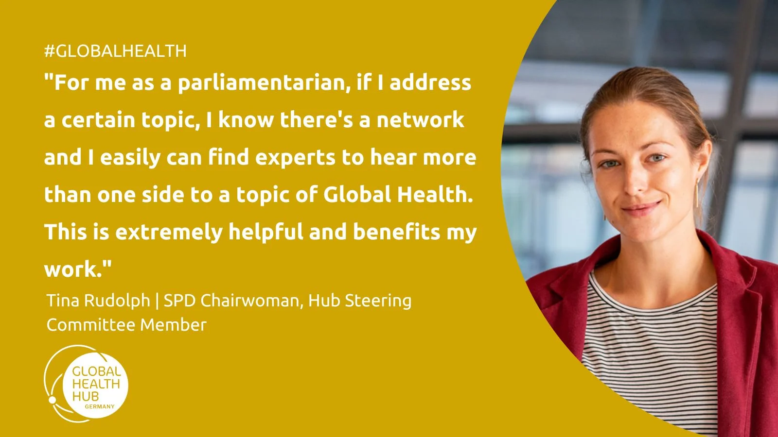 Tina Rudolph: It's great that the Hub brings together people who work and who are engaged in the field of Global Health so they can benefit from the connection and from the networks within the Hub. I come from the Northeast of Germany, I grew up in Mecklenburg-Vorpommern and when I think back 15 years ago, so when I was 15, 16 or 17, if I would have developed an interest in Global Health already back then, it would have been almost impossible for me to get a connection. Usually, you find a lot of actors in the field of Global Health in a certain region. In Germany, of course it's Berlin. But the Hub brings people together and opens the door for people who are not living in Berlin, but who are extremely benefiting by being able to participate in what the Hub has to offer. And I like the structured approach that there are usually one or two topics a year where the Hub especially deals with and brings experts together and for me as a parliamentarian of course if I try to address a certain topic, I know there's a network and I easily can find experts to hear more than one side to a topic of Global Health. So, this is extremely helpful and benefits my work.