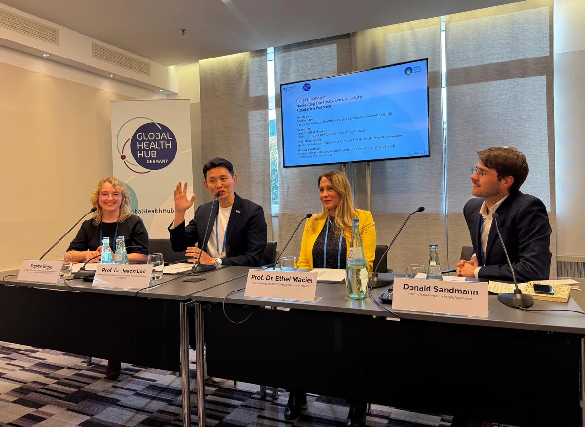 Auf die kurze Rede folgte eine Podiumsdiskussion unter der Moderation von Sophie Gepp (Center for Planetary Health Policy und Co-Vorsitzende des Lenkungskreises des Global Health Hub Germany). Als Sprecher*innen waren Prof. Dr. Jason Lee (National University of Singapore), Prof. Dr. Ethel Maciel (brasilianisches Gesundheitsministerium) und Donald Sandmann (Stiftung Gesunde Erde – Gesunde Menschen; und Co-Manager, GHHG Community Klima und Gesundheit) auf dem Panel.