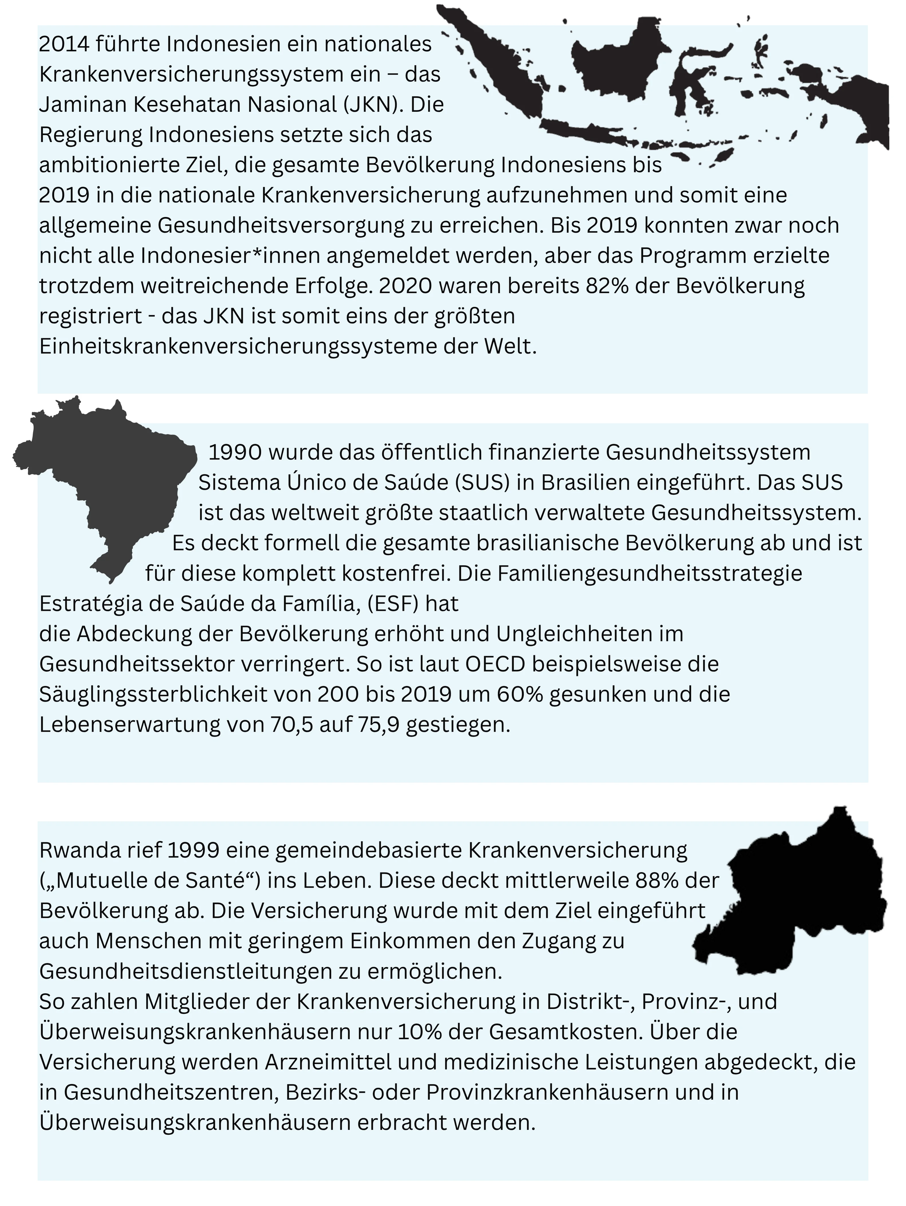 Ein wichtiger Schritt auf dem Weg zu UHC ist, dass deutlich weniger Menschen Gesundheitskosten aus eigener Tasche zahlen müssen, die im Verhältnis zu ihrem Einkommen zu hoch sind. Eine mögliche Strategie, um Gesundheitsdienstleistungen für alle Menschen erschwinglich zu machen, sind sozial gerechte, solidarische Krankenversicherungen. Im Interview mit uns erklärt Dr. Magda Robalo, dass der Auf- und Ausbau von nationalen Krankenversicherungen eine langfristige Aufgabe für Staaten ist und einer sorgfältigen Planung bedarf. Insbesondere Regularien wie bspw. die Wahl der Serviceanbieter*innen, die Abdeckung von Familienmitgliedern oder die Berechnung der Beitragssummen sind eine wichtige Voraussetzung für zuverlässige Krankenversicherungssysteme, doch laut Dr. Robalo kämpfen viele Länder gerade mit diesem Aspekt. Sie nennt jedoch Indonesien als ein positives Beispiel für die Einführung einer effektiven Krankenversicherung. Marwin Meier nennt zudem Brasilien als positives Beispiel für eine gut funktionierende allgemeine Krankenversicherung. Auf dem afrikanischen Kontinent ist Rwanda ein Vorreiter in Sachen allgemeine Gesundheitsversorgung: