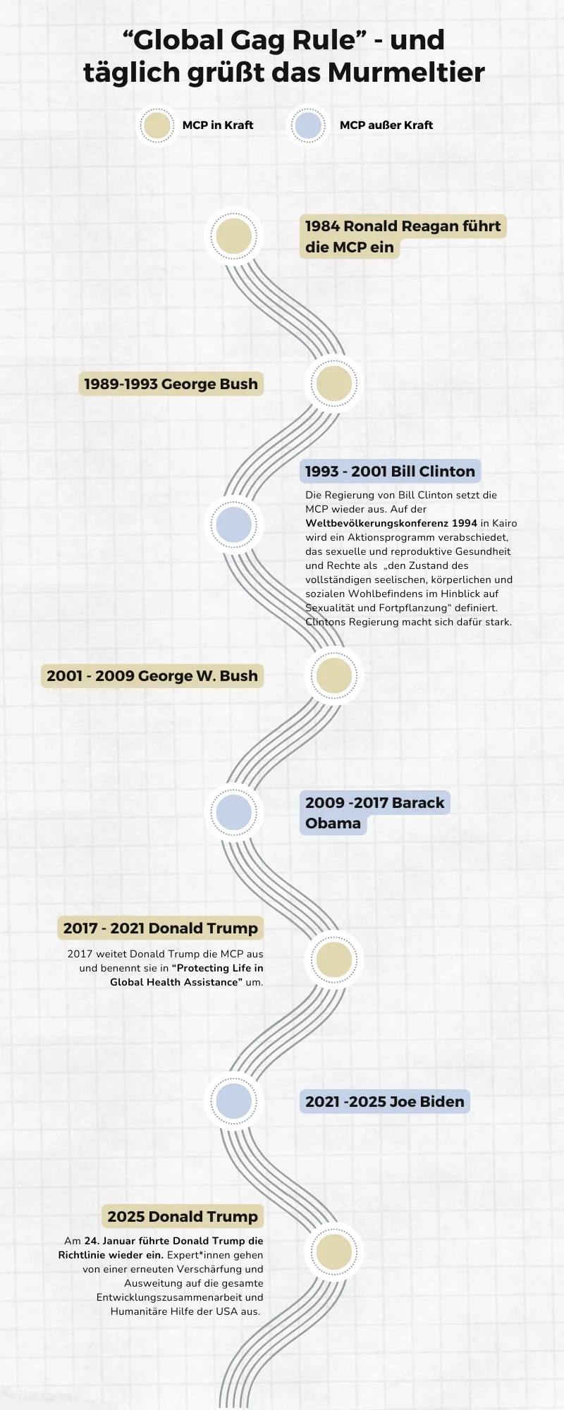 1984 stellte Präsident Ronald Reagan die Mexico City Policy (MCP) erstmals vor. Dies gab er bei der namensgebenden Weltbevölkerungskonferenz bekannt, die im August 1984 in Mexico City stattfand. Seit ihrer Einführung hat sie das Engagement von Nichtregierungsorganisationen (NROs) für sichere Schwangerschaftsabbrüche erschwert. Denn die Regel besagt, dass Organisationen, die finanzielle Mittel für Familienplanung aus den USA erhalten wollen, keine Informationen oder Beratung über Schwangerschaftsabbrüche anbieten dürfen –