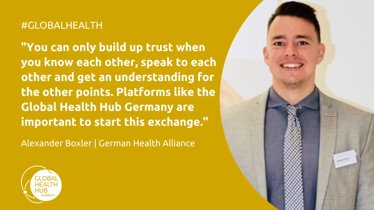 The Steering Committee of the Global Health Hub Germany is composed of eight different stakeholder groups. One of them is the private sector and it is represented by “GOPA Worldwide Consultants GmbH” and the "German Health Alliance" (GHA). Alexander Boxler, managing director of the GHA, was invited to the Hub Community for Global Health Partnerships to provide insights into the work of the GHA and the importance of private sector partnerships for global health. GHA is an initiative of the Federation of German Industry e.V. (BDI). Its 120 members from various sectors, such as industry, academia, foundations, NGOs  and governmental development organisations, form the core of the GHA. The network places a strong focus on medical technology, pharmaceutical and consulting companies. The overall goal of GHA’s work is strengthening health systems. To reach this, it strives for multisectoral cooperation between governments, the private sector, academia and civil society. It works with parliamentarians and ministries to put global health on the political agenda, both in Germany and internationally, and advocates for investments in health. It also communicates the interests of its members to policymakers by writing position papers. For example, it contributed to the preparation of the Federal Government’s Global Health Strategy. The GHA also is a platform for the exchange of actors from the health sector and a contact for German and foreign governments on health issues with international reference. The members of the GHA are informed about relevant global health events, topics, and current developments. For its members it organises conferences and round tables with specific working groups on specific topics. This is how they can network and find out whether potential collaborations would be useful.