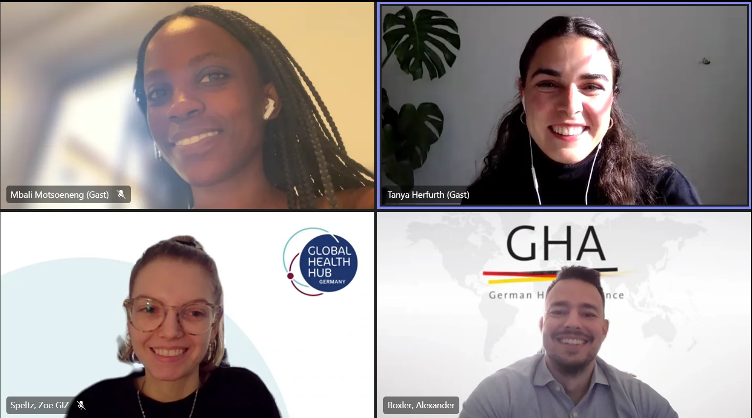 At the Hub Community Meeting “Partnerships for Global Health” on 27 October 2022, Alexander Boxler, Managing Director of the German Health Alliance, unfolded the value of private sector partnerships for global health. (F.l.t.r.: Mbali Motsoeneng, Tanya Herfurth, Zoé Speltz and Alexander Boxler)