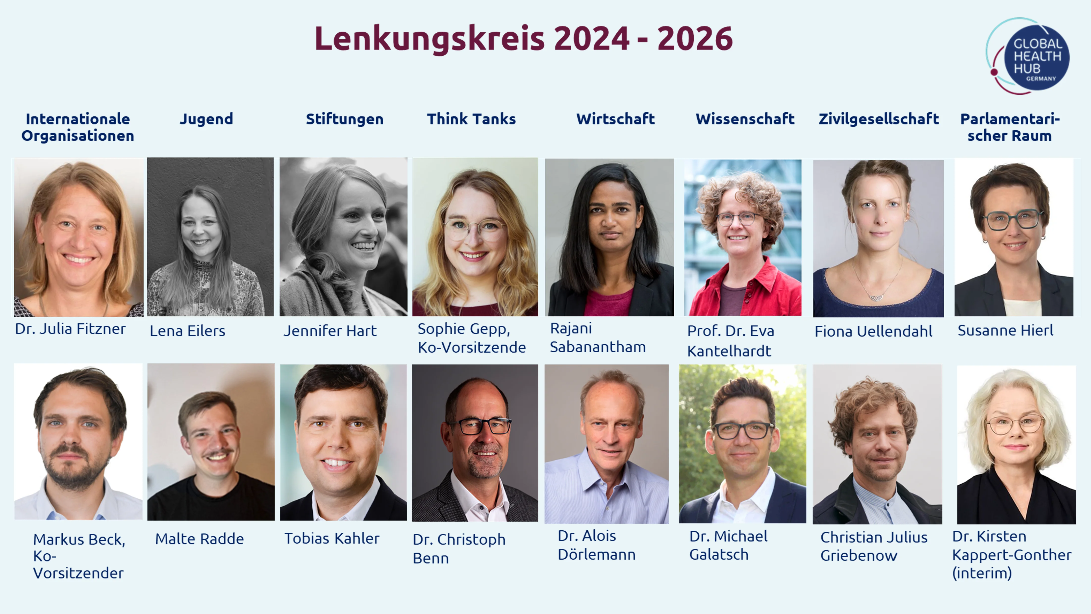 Außerdem gehören dem Lenkungskreis weitere nicht-stimmberechtigte Mitglieder als Beisitzer*innen an: der Präsident des World Health Summit, die Leitung der Vernetzungsplattform „Forschung für Globale Gesundheit“ (GLOHRA) sowie Vertreterinnen und Vertreter der Bundesregierung (BMG, BMZ, BMFTR, AA, BMUKN und BMELH).