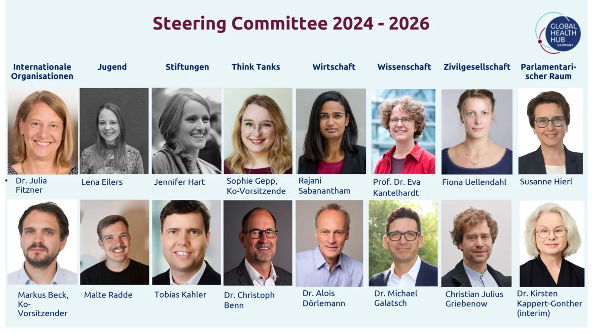 In addition, the steering committee has additional non-voting advisory members: the president of the World Health Summit, the head of the networking platform "Research for Global Health" (GLOHRA), and representatives of the German government (BMG, BMZ, BMFTR, AA, BMUKN and BMELH).