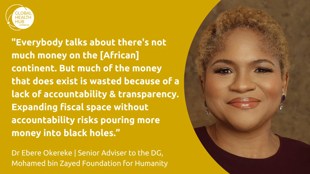 At the same time, she challenges the framing of “rethinking donor models” itself. The more important question, she argues, is how countries build credible investment cases and national frameworks that enable partners to invest in existing systems rather than (re)creating them. She points to the scale of resources already flowing through out-of-pocket spending, the diaspora, and health tourism, and emphasizes that the task is to channel these more effectively. She also highlights the need to disincentivise these parallel systems. When NGOs or international actors do not pay taxes while operating alongside local private sector providers, this can disadvantage local capacity and distort markets.