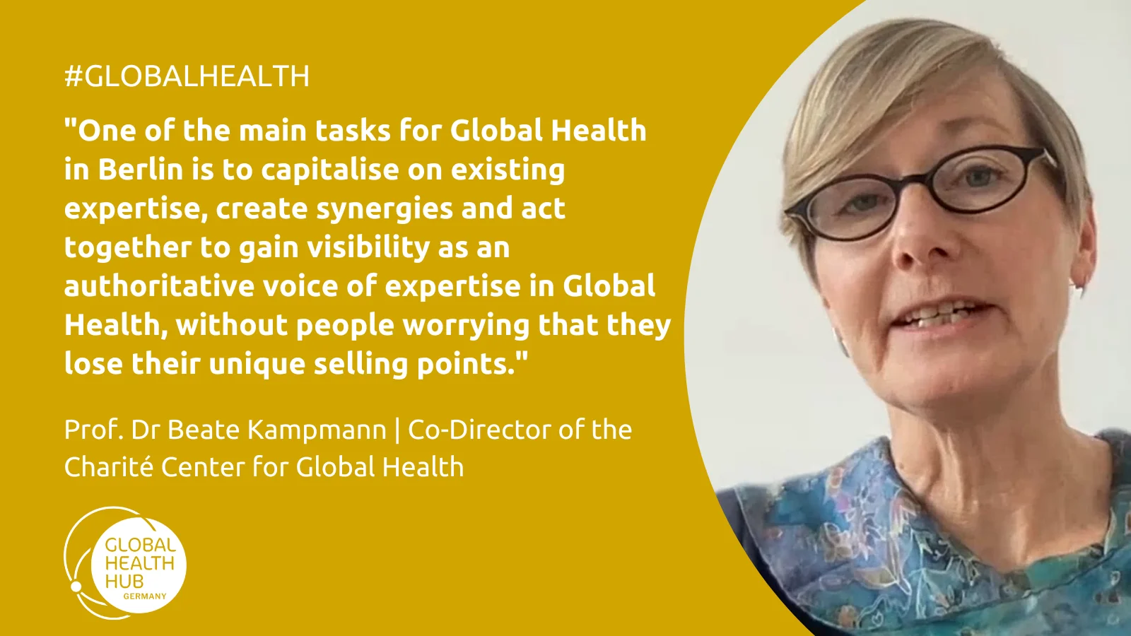 Beate Kampmann: The key function of the position is to provide a roof over the head of the many “rooms” in which excellent work and research is already happening. So, one of the main tasks for Global Health in Berlin is to capitalise on existing expertise, create synergies and act together to gain visibility as an authoritative voice of expertise in Global Health, without people worrying that they lose their unique selling points. Since it's such an important general topic, we need to share insights and ideas.
