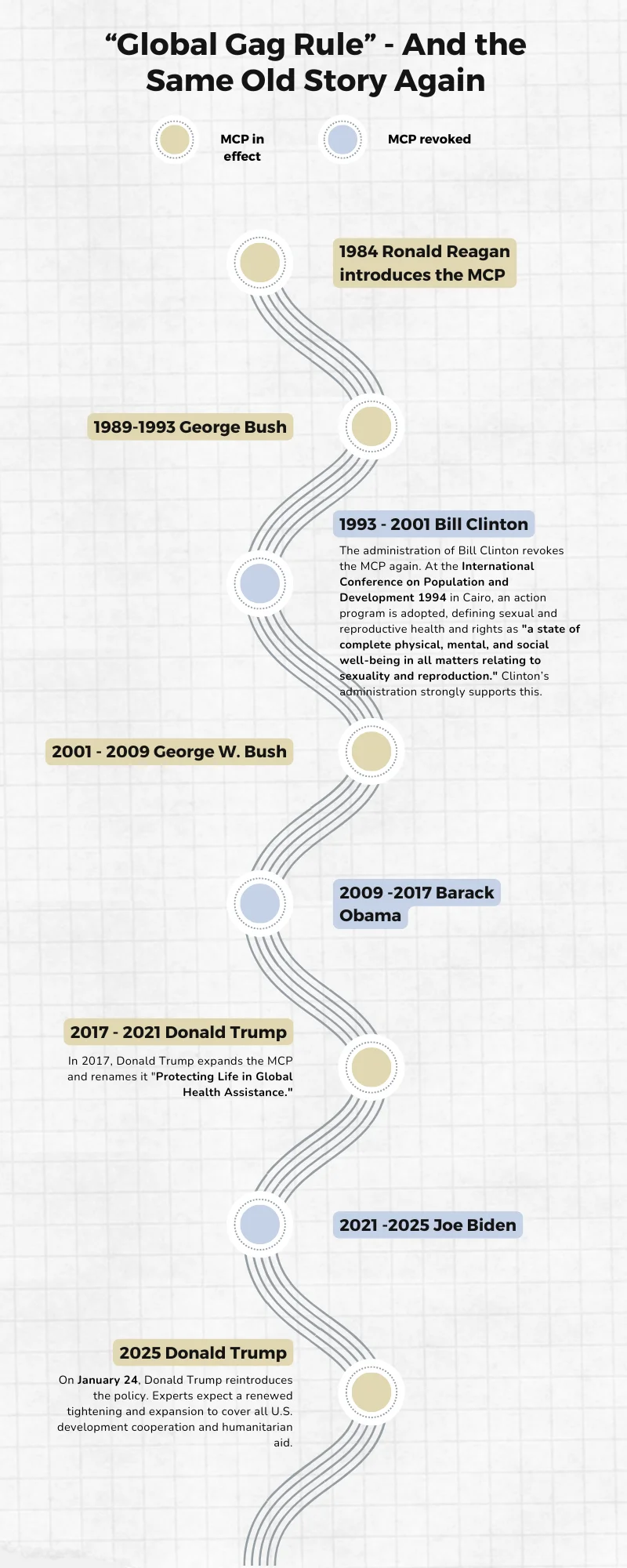 On Friday, January 24, 2025, Trump also reinstated— as expected—the anti-abortion policy known as the "Mexico City Policy." He deliberately chose the 52nd anniversary of the Roe v. Wade decision by the US Supreme Court, which had established a nationwide right to abortion in 1973 but was overturned in 2022. The Mexico City Policy has devastating consequences for sexual and reproductive health and rights worldwide.