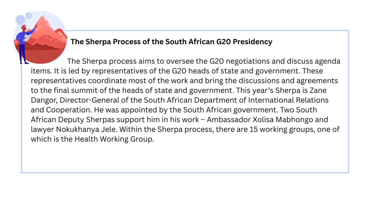 The involvement of civil society perspectives in G20 decisions is mainly driven by the Civil Society 20 (C20) initiative. Unlike the G20 (and G7), the C20 is not made up exclusively of civil society actors from G20/G7 member states but is also open to participants from other countries. A first meeting of the C20 Global Health Working Group has not taken place during the first trimester of 2025. Even during the initial meetings of the G20 Health Working Group, there have been no statements from civil society. However, it is certain that this civil society working group will exist, as reported to us by Marwin Meier. He is a political advisor for health and migration at World Vision, with over 20 years of experience in the health sector across various civil society organizations. Initially, he worked for ADRA (Adventist Development and Relief Agency) as a country director in Togo and the Philippines. He then joined World Vision, first working on HIV/AIDS and later on maternal and child health. He has been actively involved in the C20 processes since 2007 and has participated in three Sherpa processes.