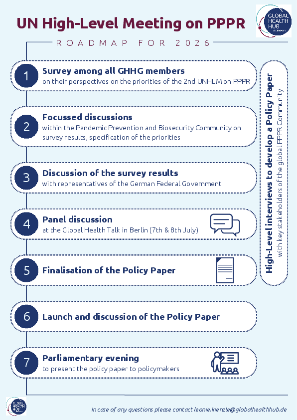 The Global Health Hub Germany (GHHG) will accompany the UN High-Level Meeting from a German non-state perspective, led by our Community on Pandemic Prevention and Biosecurity. We are therefore inviting new members to join the community and actively contribute to this important international process.
